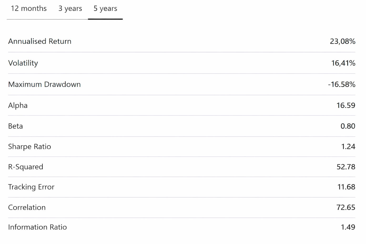 On the other hand, this set of metrics highlights the quality of returns generated by the strategy over the last five years. The combination of a high annualised return, moderate volatility, and a Sharpe ratio above 1 points to strong risk-adjusted performance. A beta below 1 suggests lower sensitivity to market movements, while the elevated alpha and information ratio confirm that returns have been primarily driven by active stock selection rather than market exposure. π§π