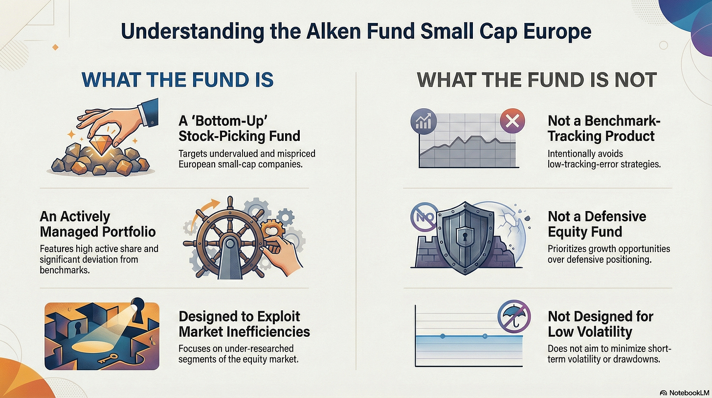 In summary, Alken Fund Small Cap Europe is a pure-play European small-cap equity strategy, investing in listed companies across developed European markets with smaller market capitalisations.π§ ποΈ