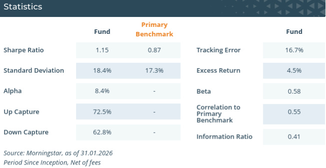 Regarding the risk statistics we can highlight the differentiated nature of the strategy. With a beta of roughly 0.58 and a correlation near 0.55 to the benchmark, the portfolio behaves differently from traditional global equity funds. This lower correlation suggests that the strategy can provide diversification benefits within a broader equity allocation.
