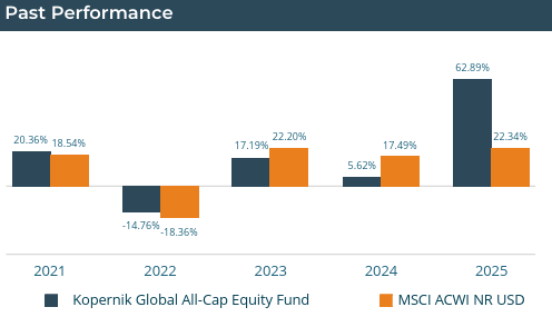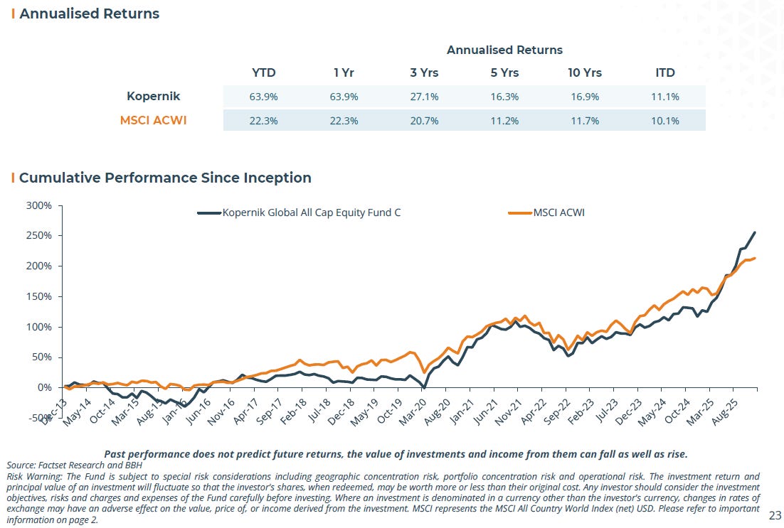 The fund can diverge meaningfully from the benchmark during certain market phases, but when undervalued sectors re-rate the upside can be substantial. A recent example is the strong annual performance where the fund delivered around 70% versus roughly 22% for the MSCI ACWI, illustrating how a valuation-driven portfolio can benefit when market sentiment shifts. ππ