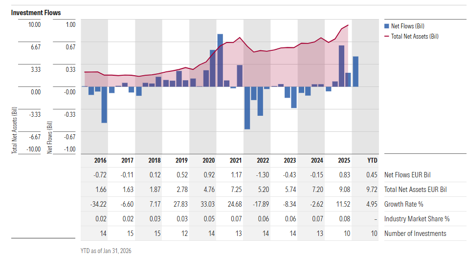 Investment flows provide a useful perspective on how investors behave around the strategy. Over time, the chart shows that net flows tend to move in cycles, with periods of inflows often following strong performance and outflows appearing after weaker market phases.