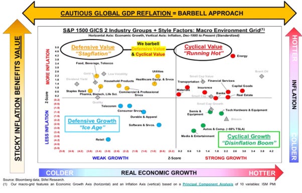 On the other hand, this ties quite well with what we see in the second chart, where the focus shifts from short-term shocks to the broader macro regime. The current setup looks like a reflation environment, with inflation still present and growth holding up, and thatβs where the idea of a barbell comes in.