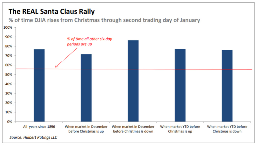 This chart highlights the historical tendency for U.S. equities to post positive returns during the so-called Santa Claus Rally period, defined as the days from Christmas through the second trading session of January.