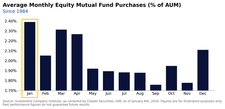 The chart shows that January remains the strongest month for equity fund inflows, and this pattern is once again playing out at the start of the year.π