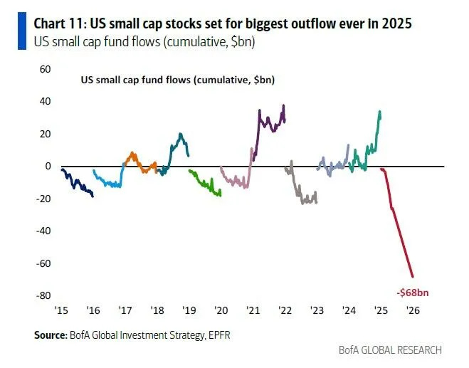 In contrast to elevated sentiment, US small cap funds are experiencing record outflows, pointing to broad-based derisking rather than incremental rotation. While this weighs on near-term small cap performance, flows of this magnitude have often marked late-cycle risk reduction phases, as investors retreat toward liquidity and balance sheet strength. Historically, such extremes can eventually set the stage for selective mean reversion once macro uncertainty stabilizes.ππ§
