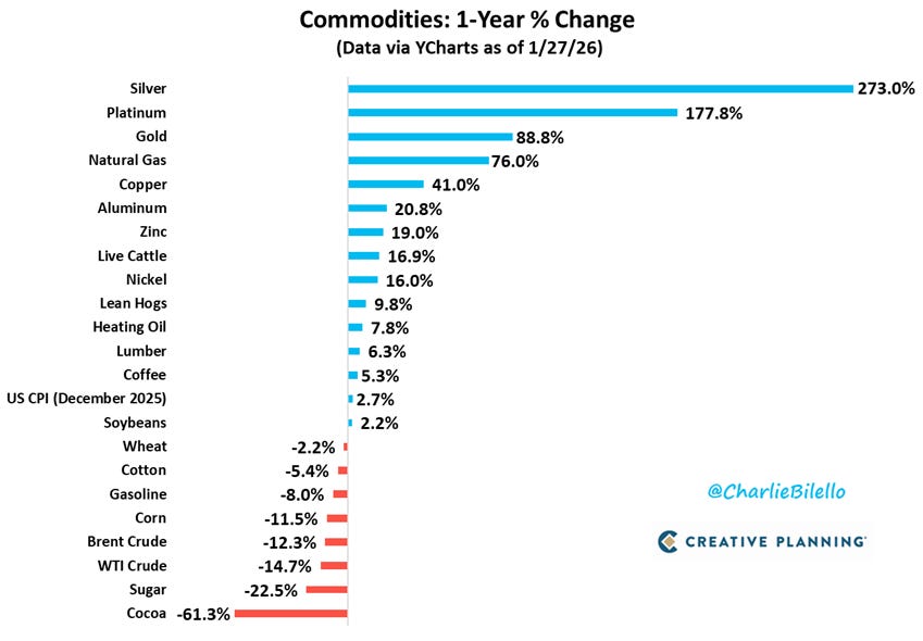 At the same time, risk is quietly being repriced elsewhere. As shown in the second chart, precious metals have surged over the past year, with silver, platinum and gold clearly standing out. This is not a broad commodity boom. Instead, it reflects rising geopolitical uncertainty, demand for hard assets, and early hedging against financial and currency risks. πͺπ