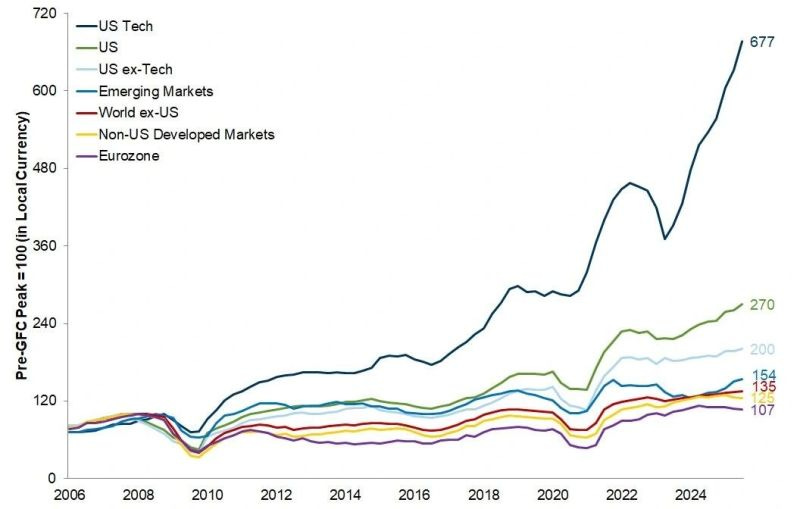 As you noticed, when we strip out technology, the picture becomes less convincing. U.S. equities ex-Tech look far closer to the rest of the world, highlighting how dependent recent performance has been on a small group of mega-cap winners.