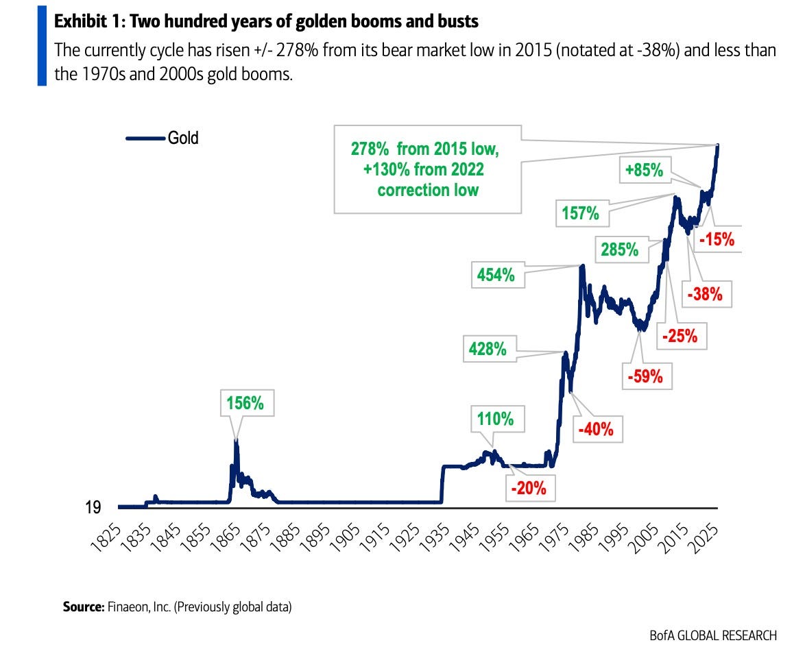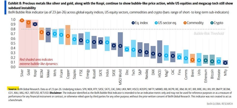 Finally, the last image reinforces this diagnosis, showing bubble-like dynamics in precious metals compared to other asset classes. This aligns with institutional data indicating historically low hedge levels, as confirmed by recent global fund manager surveys.